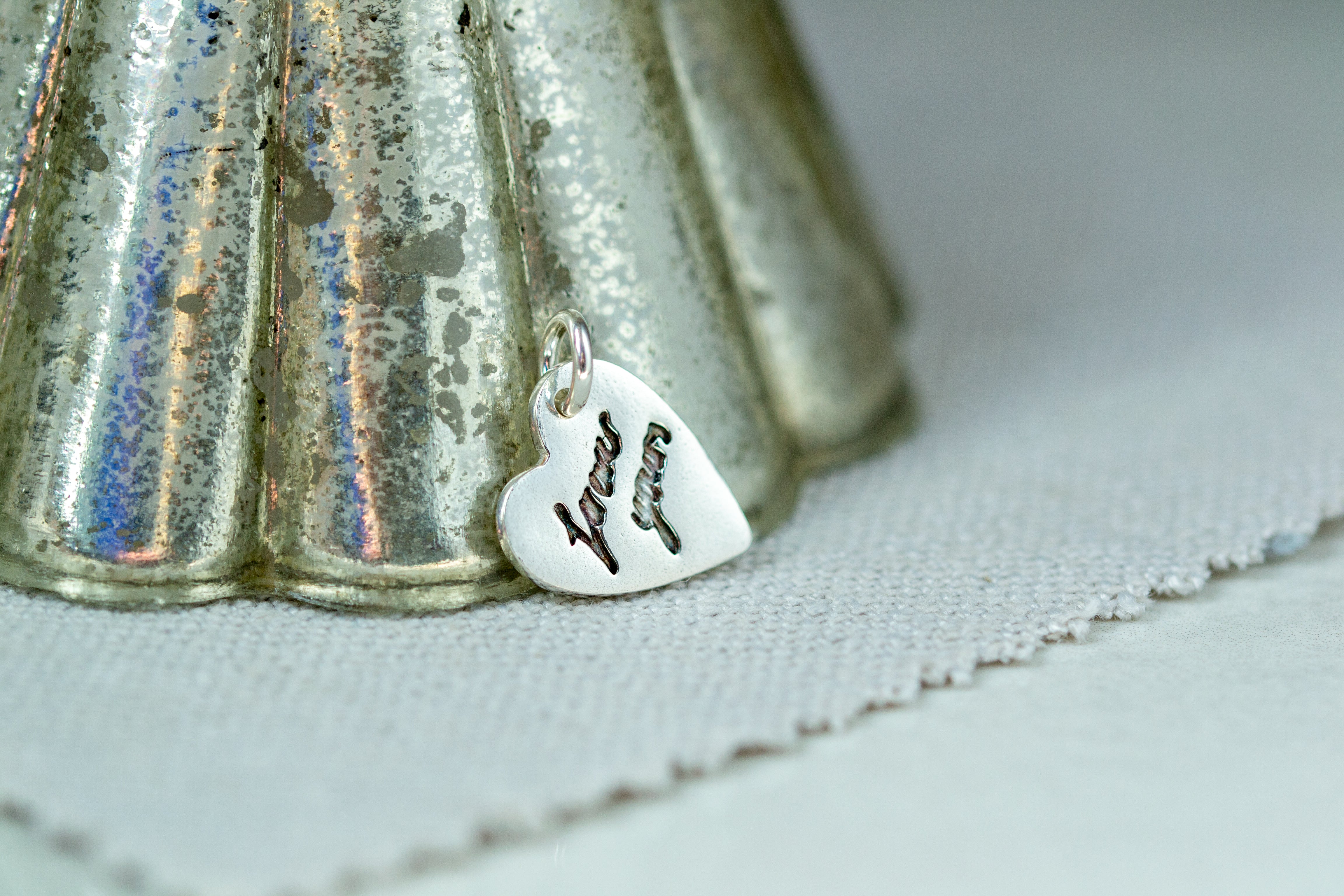 Enhance your charm collection with our simple sterling silver charm, featuring custom handwriting jewellery. This charm captures an original handwritten name or phrase on one side, with a name and age engraved on the reverse, making it a unique and personal keepsake. Each charm is handmade and comes with a silver jump ring, allowing it to be easily attached to an existing bracelet or necklace. To create your personalised charm, simply take a clear picture of the handwriting and upload it with your order. Choose from a variety of charm shapes, and your finished handwriting jewellery will arrive beautifully packaged, complete with a polishing cloth and care advice.