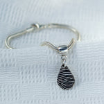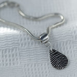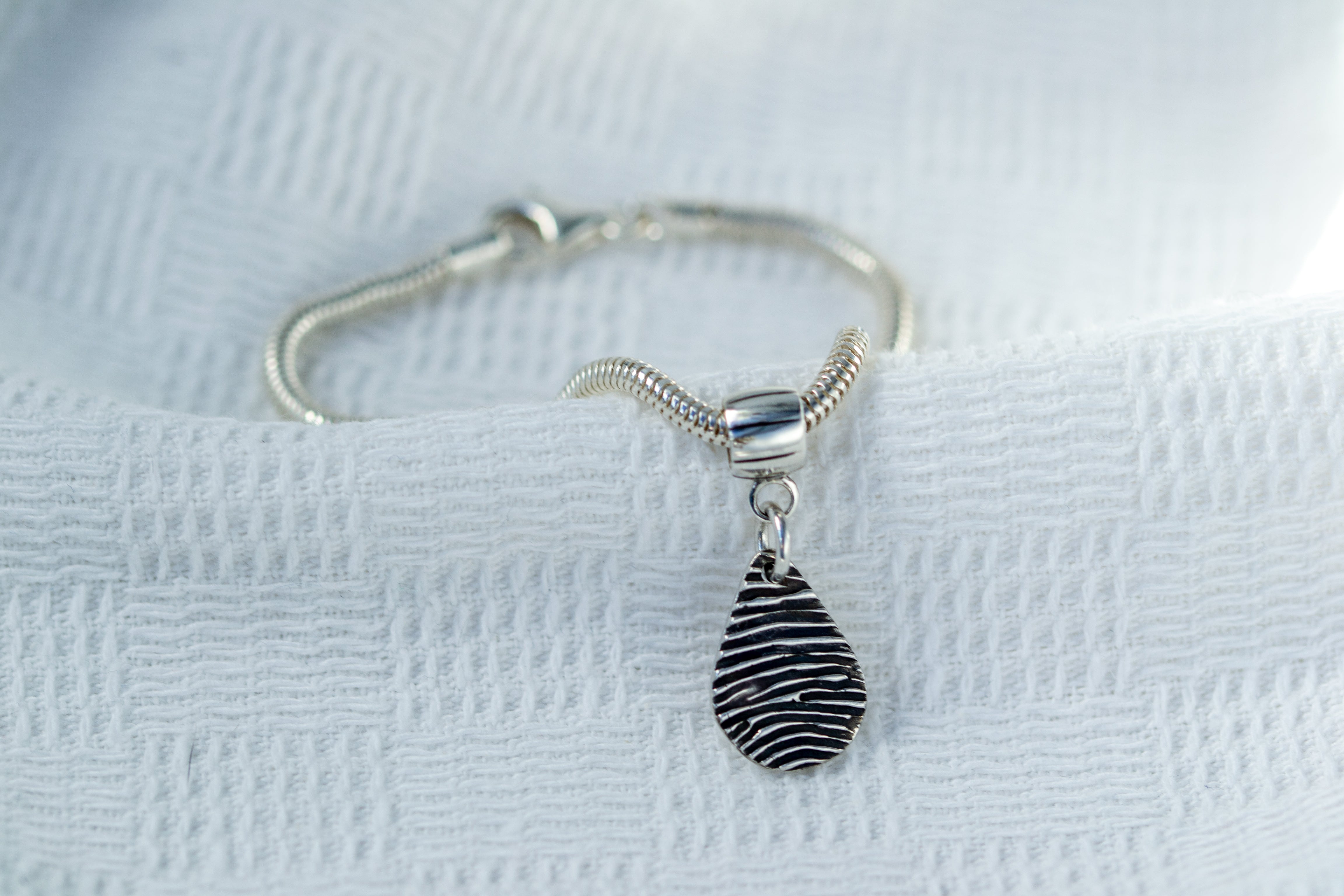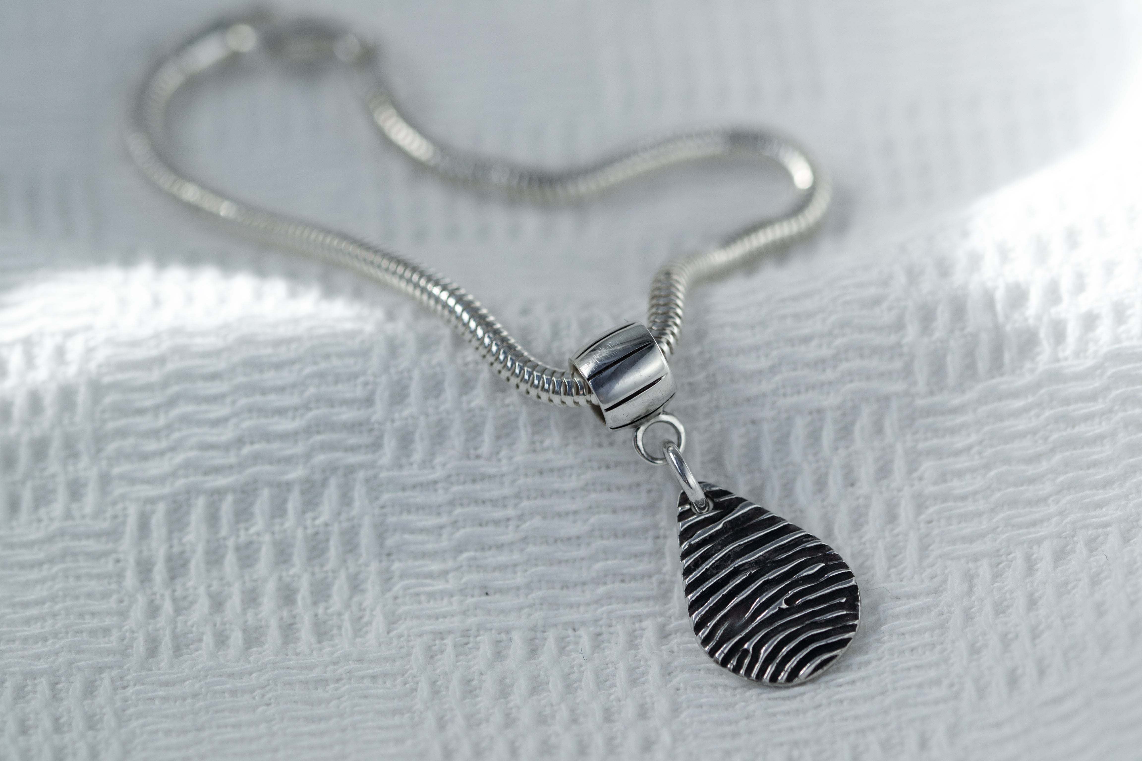 Create a meaningful tribute with our memorial fingerprint jewellery, featuring a sterling silver charm that captures the unique texture of a fingerprint. Attached to a silky snake chain bracelet with a Pandora-compatible carrier, this piece offers versatility and elegance. Upload an ink fingerprint or add an ink kit to capture it at home. Personalise the charm with a name and age engraving, all included in the price. This timeless keepsake combines thoughtful design with expert craftsmanship, honoring your loved one’s memory beautifully.
